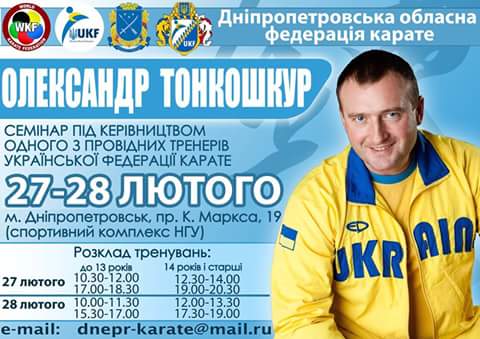 27-28 февраля на базе спортивного комплекса Национального горного университета состоялся технический семинар одного из ведущих тренеров Украинской федерации каратэ - Александра Тонкошкура. В мероприятии приняли участие более 70 спортсменов из клубов Днепропетровской области. Как всегда, тренировки пронеслись молниеносно на фоне позитива и упорной работы...В рамках семинара было проведено собрание Днепропетровской областной федерации каратэ, на котором были подведены итоги проделанной работы за год, а они значительные: прирост медалей, завоеванных днепропетровскими спортсменами на всеукраинских турнирах УФК, медали на молодежном и взрослом Чемпионате Украины по каратэ, места в сборной команде Украины... Вице-президент Украинской федерации каратэ Александр Тонкошкур отметил динамичный рост нашего региона, а также отметил благодарностью УФК клубы-лидеры по результатам 2015 спортивного года: СК "Легенда" (президент - Кирсанов К.В.), СК "Иппон" (президент - Зима А.Н.), СК "Рэнсэй" (президент - Еланская А.А.). Кроме того благодарностью были отмечены: Кравченко Екатерина - секретарь Днепропетровской областной федерации каратэ, Реут Евгений - председатель судейского комитета, и конечно же - президент Днепропетровской областной федерации каратэ, сплотивший команду единомышленников - Владимир Николаевич Вилянский. Днепропетровское каратэ неумолимо будет развиваться и покорять новые вершины в будущем, ведь мы - одно целое, единая команда. ДНЕПР - ВПЕРЕД!!!
